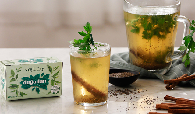 "3 poşet Doğadan Yeşil Çay'ı 400 ml taze kaynatılmış su ekleyerek 3 dakika demleyin. Poşetleri çıkardıktan sonra 500 ml oda sıcaklığında su ekleyerek bazı hazırlayın. Ardından chia tohumu ve maydanoz ve çubuk tarçını ekleyip, en az 3 saat buzdolabında beklettikten sonra gün içinde aralıklarla tüketebilirsiniz.