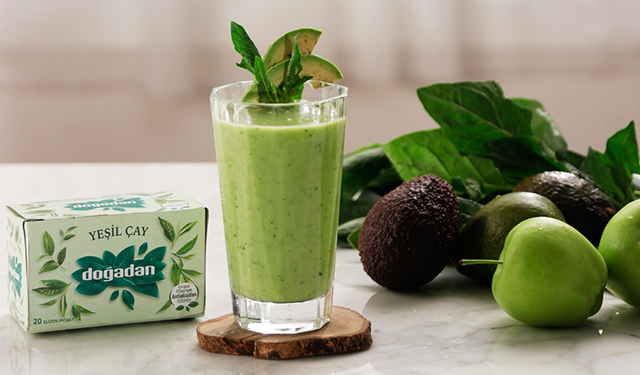 "4 poşet Doğadan Yeşil Çay'ı 500 ml taze kaynatılmış su ile 3 dakika demleyin. Poşetleri çıkardıktan sonra demlenmiş çayı yarım saat buz dolabında soğuması için bekletiniz. Tüm malzemeleri koyarak smooth hale gelene kadar blendırda çekip servis edebilirsiniz.