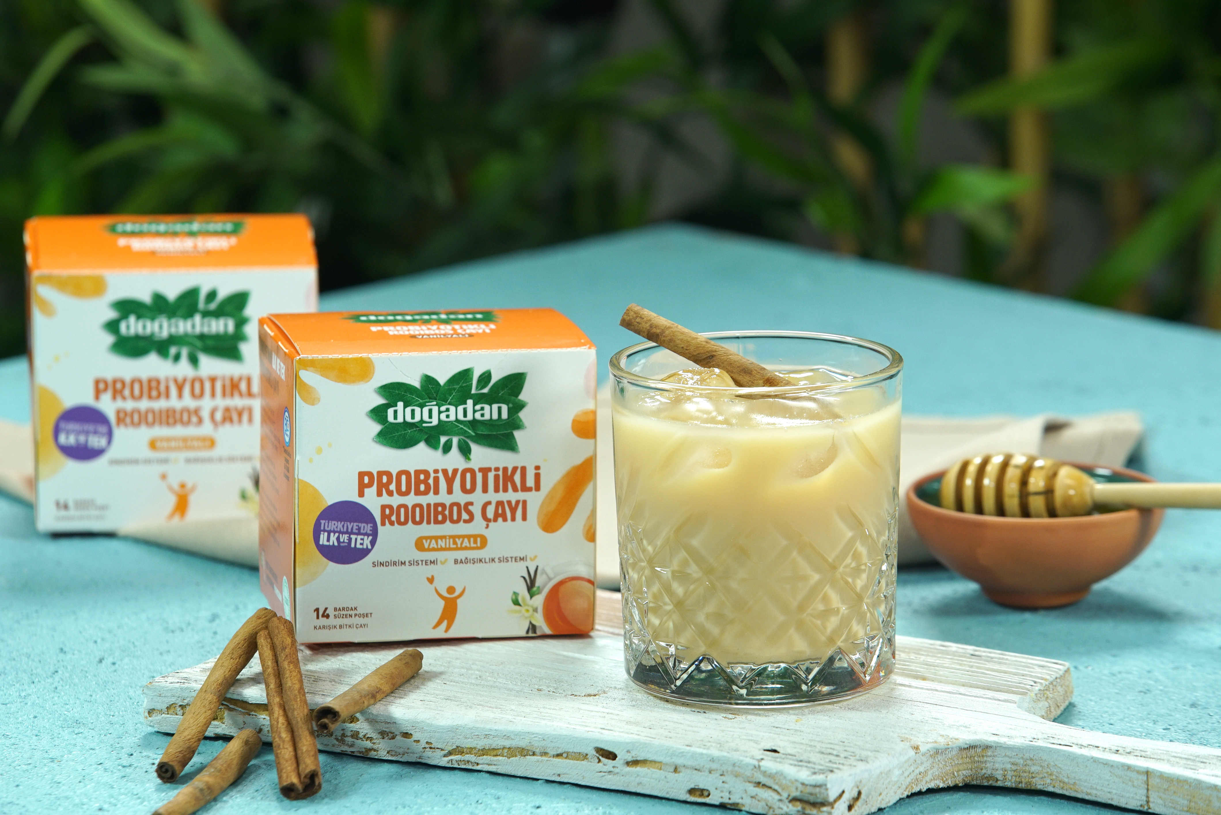 400 ml taze kaynatılmış su ile 4 poşet Doğadan Probiyotikli Rooibos Vanilyayı 5 dakika demleyin. Yarım tatlı kaşığı bal, 15 küp buz ve 100 ml (yarım su bardağı) soğuk süt ekleyin. Son olarak 1 adet çubuk tarçın ile Iced lattenizi tatlandırabilirsiniz.