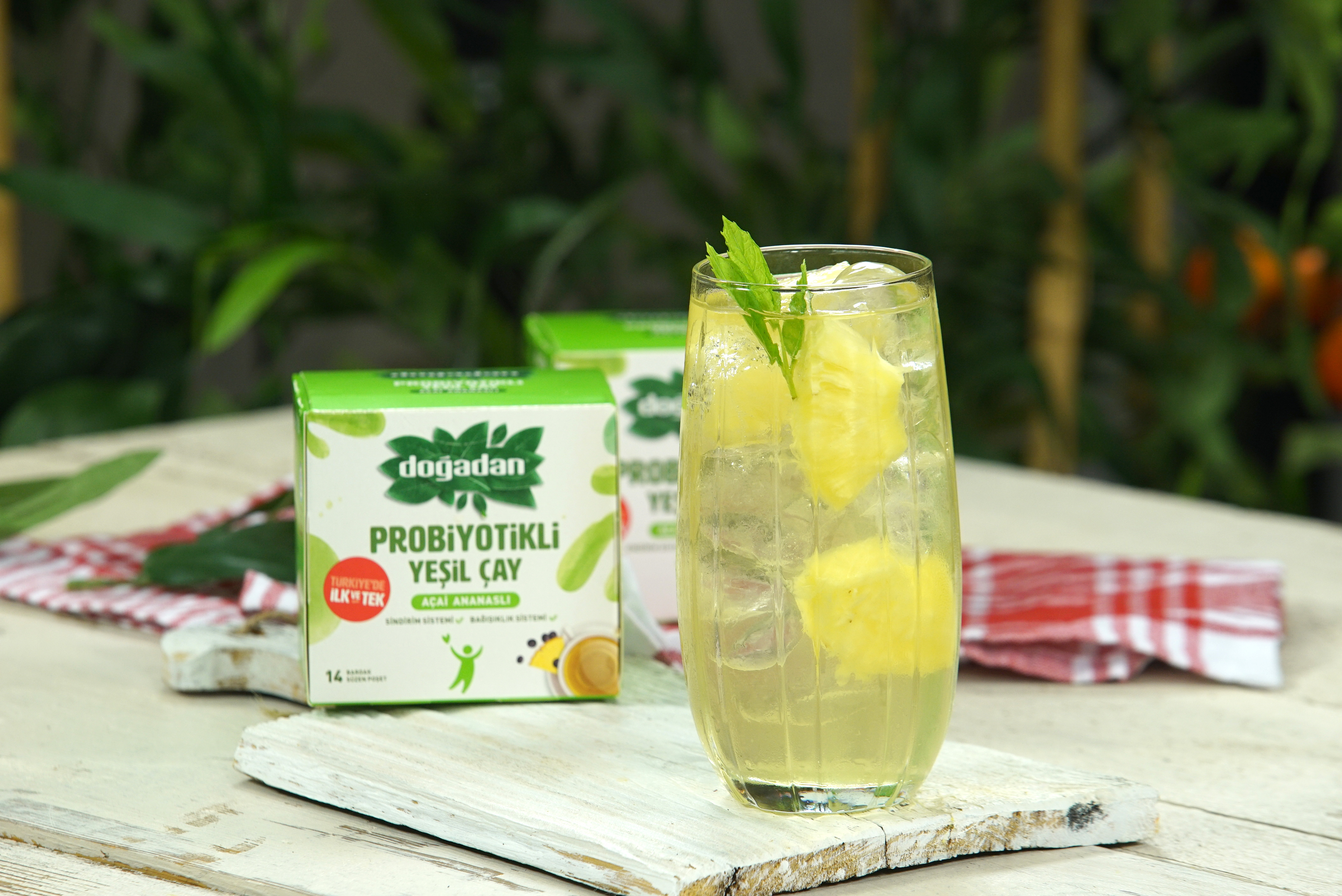 400 ml kaynatılmış ve 2 dakika bekletilmiş yaklaşık 80 C sıcaklıktaki suya 4 poşet Doğadan Probiyotikli Açai Ananaslı Yeşil Çay’ınızı ekleyin ve 3 dakika demleyin. Üzerine 400 ml soğuk su, 3 kaşık bal, 2 dilim ananas, 8-10 küp buz ekleyerek soğuk çayınızı hazırlayabilirsiniz.