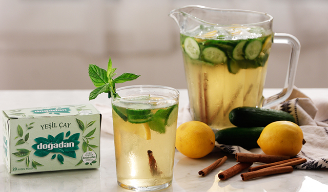 "3 poşet Doğadan Yeşil Çay'ı 400 ml taze kaynatılmış su ekleyerek 3 dakika demleyin. Poşetleri çıkardıktan sonra 500 ml oda sıcaklığında su ekleyerek bazı hazırlayın. Ardından salatalığı ve limonu kabuğuyla beraber yuvarlak dilimler halinde keserek çayınıza ekleyin. Son olarak tarçın çubuklarını ve nane yapraklarını ekleyip, en az 3 saat buzdolabında beklettikten sonra gün içinde aralıklarla tüketebilirsiniz.